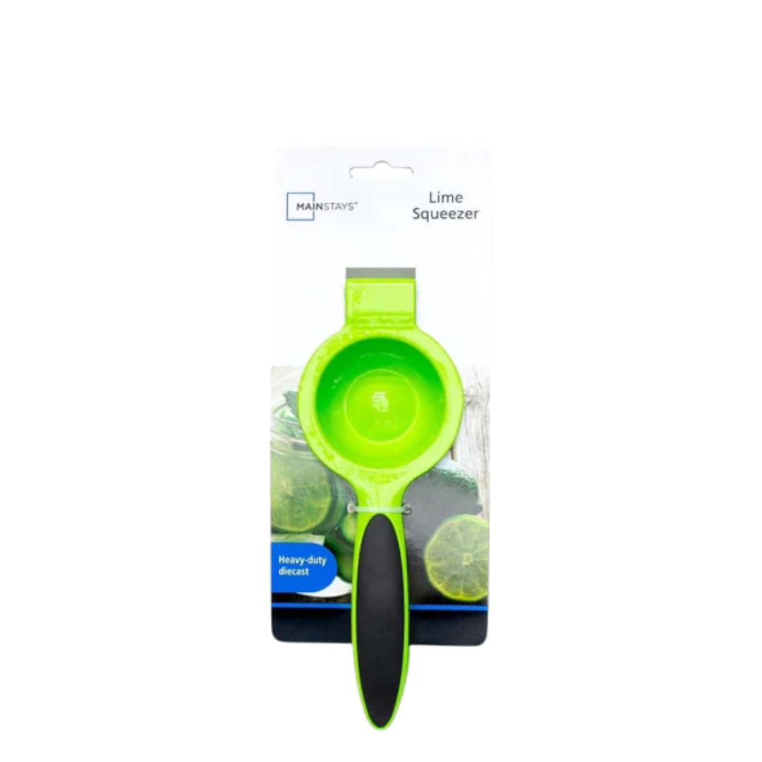 Mainstays Heavy Duty Die Cast Manual Lemon Juicer/Squeezer with Silicone Grips inserted into handles. This juicer is press made from heavy die cast aluminum and features 6 holes that keep the seeds out of your juice. The handle has a rubber comfort grip embedded to provide ease in pressing the juice. Easy to clean with a soft brush or sponge and liquid dishwashing detergent while cooking. You may also add to the top rack of your dishwasher after cooking is completed. Dishwasher safe.